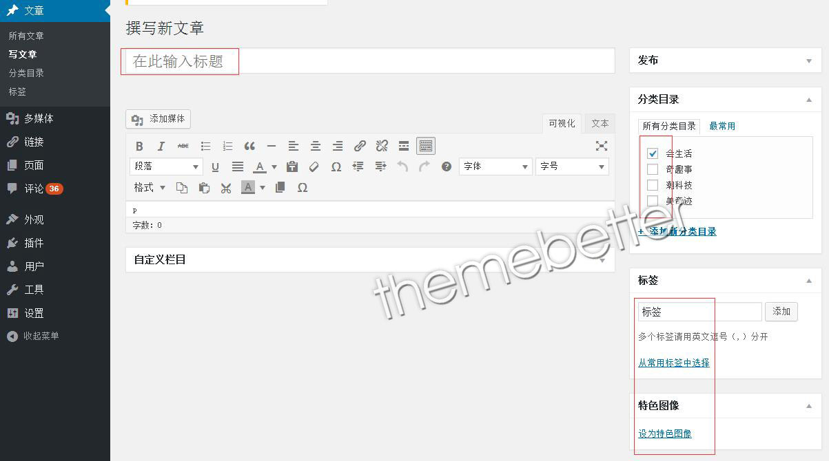 写完好一篇文章后在右边分类目录中选择该文章要添加在哪个目录下就把那个勾选,然后添加标签、特色图像等。
