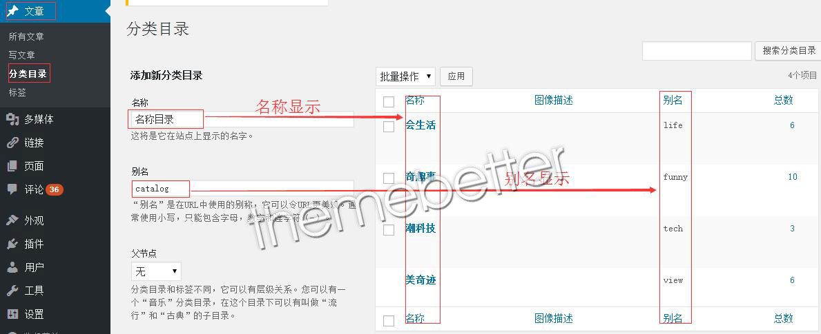 第一步、后台-文章-分类目录-添加新分类目录,如图