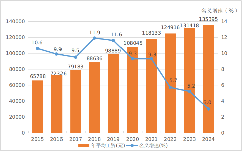 2024年,广东城镇非私营单位就业人员年平均工资135395元,同比增长3.0%,其中,在岗职工年平均工资137468元,增长3.0%。