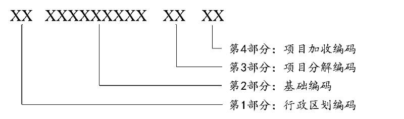 第1部分:行政区划编码,采用国家标准行政区划代码前两位编码,用“00”表示国家统一的医疗服务项目,用“11”、“12”等表示相关省份的临时医疗服务项目。
