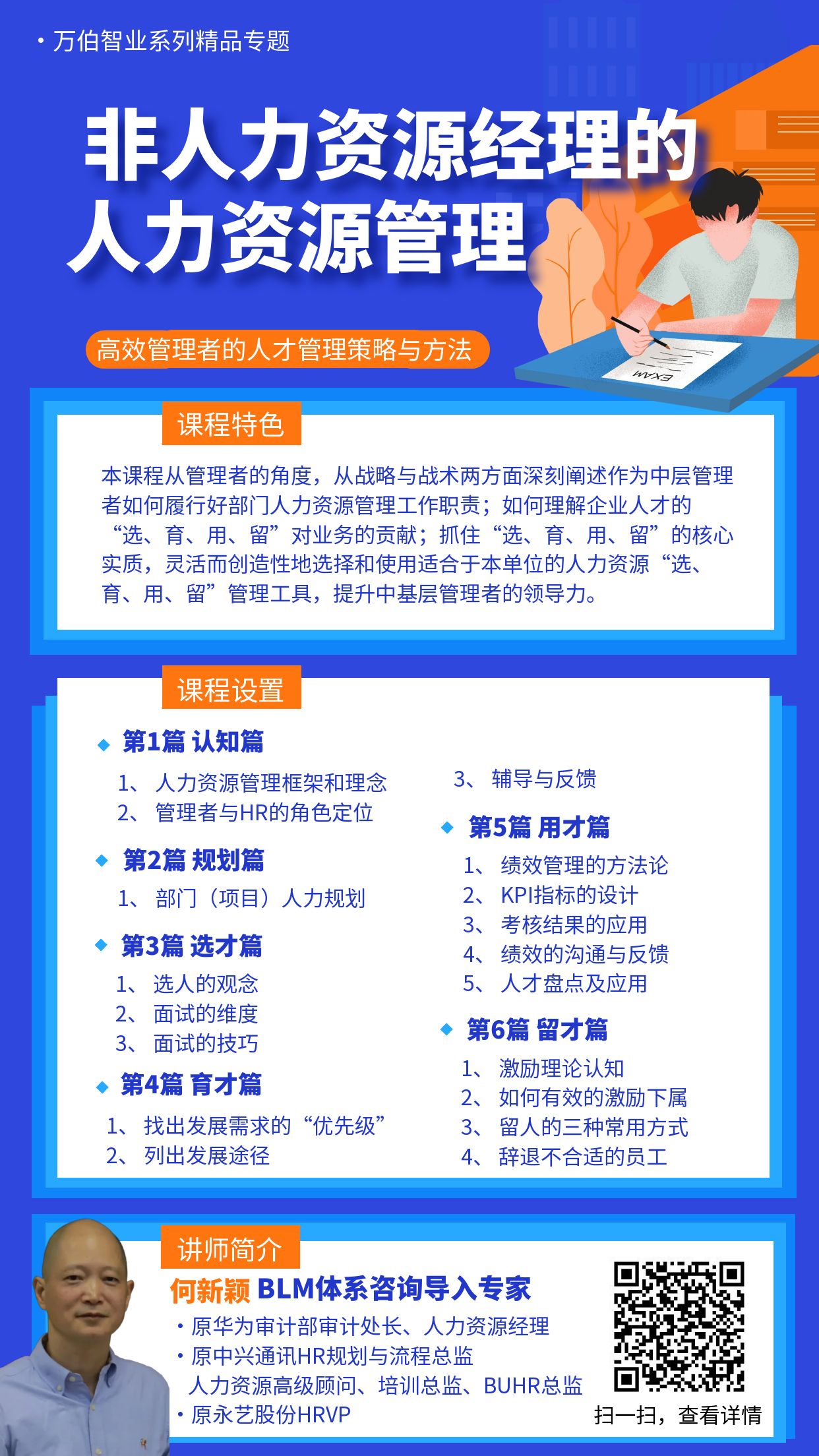本课程从管理者的角度,从战略与战术两方面深刻阐述作为中层管理者如何履行好部门人力资源管理工作职责;如何理解企业人才的“选、育、用、留”对业务的贡献;抓住“选、育、用、留”的核心实质,灵活而创造性地选择和使用适合于本单位的人力资源“选、育、用、留”管理工具,提升中基层管理者的领导力。