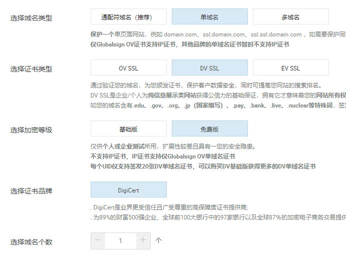 选择域名类型:单域名;选择证书类型:DV SSL;选择加密等级:免费版;选择证书品牌:DigiCert